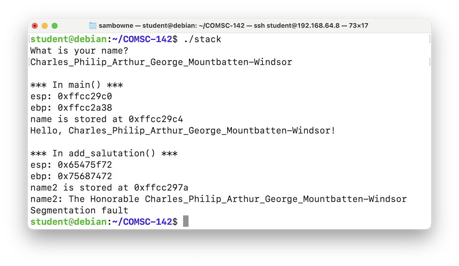 Charles_Philip_Arthur_George_Mountbatten-WindsorThe program crashes in the add_salutation() function, with a "Segmentation fault" message, as shown below.