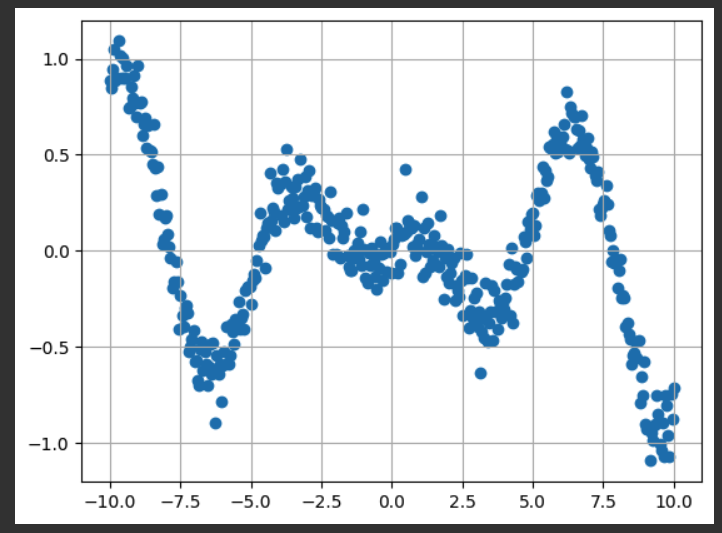 y_data = 0.1*x_data*np.cos(x_data) + 0.1*np.random.normal(size=400)