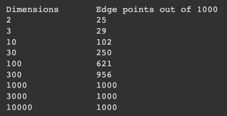 print("Dimensions \t Edge points out of 1000")