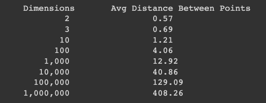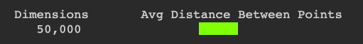 print("Dimensions \t Avg Distance Between Points")