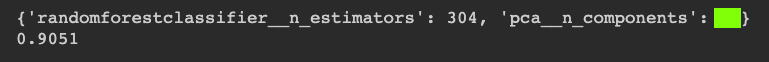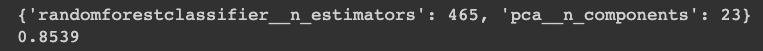 This model uses RandomizedSearchCV to find a good combination of hyperparameters for both PCA and the random forest classifier. The only two hyperparameters tested are pca__n_components and randomforestclassifier__n_estimators.