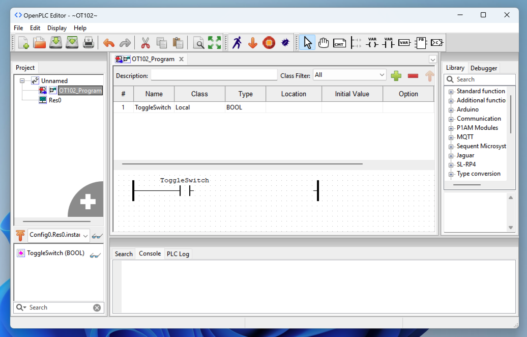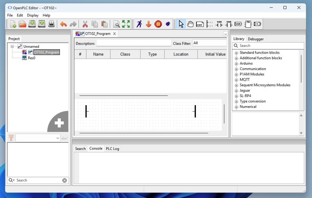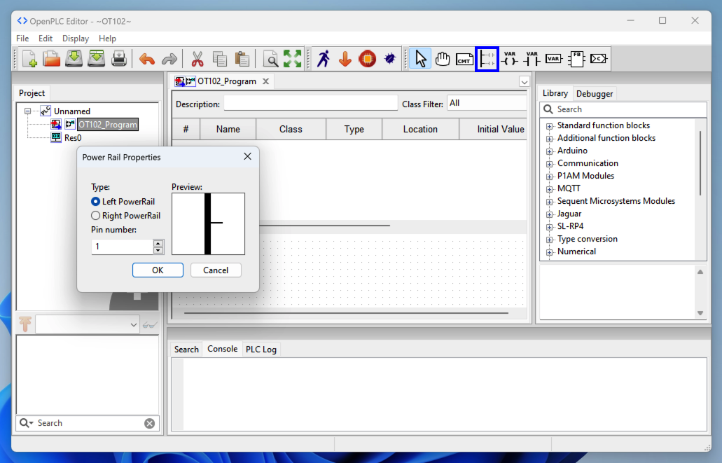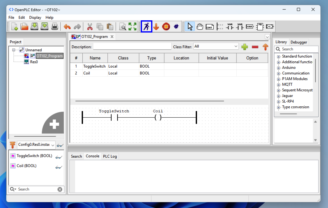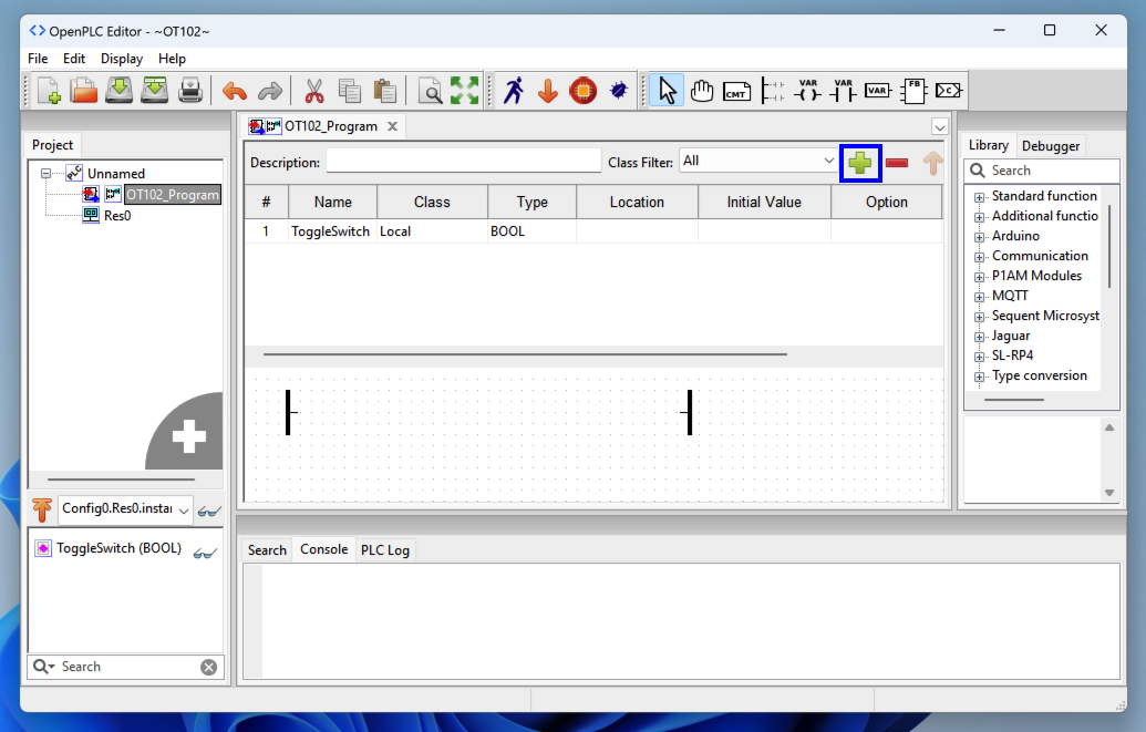 In OpenPLC Editor, at the top right, click the "Create a new contact" button, outlined in blue in the image below.