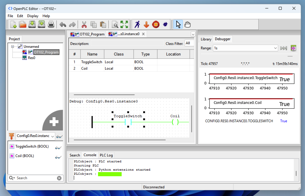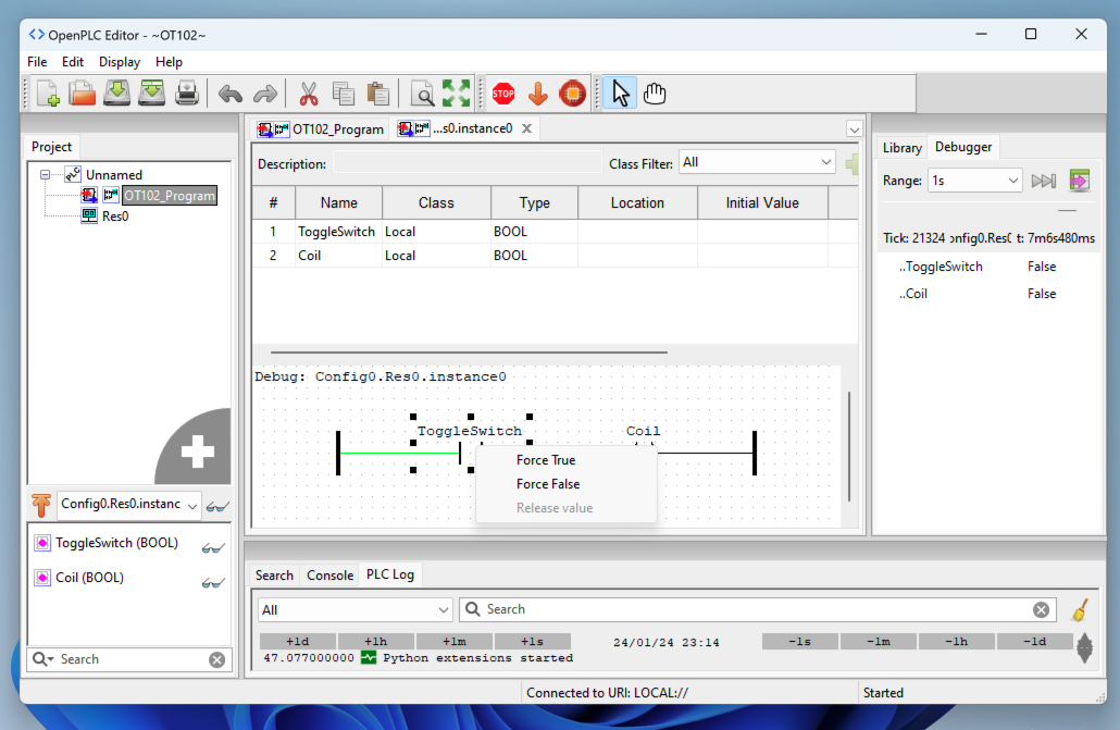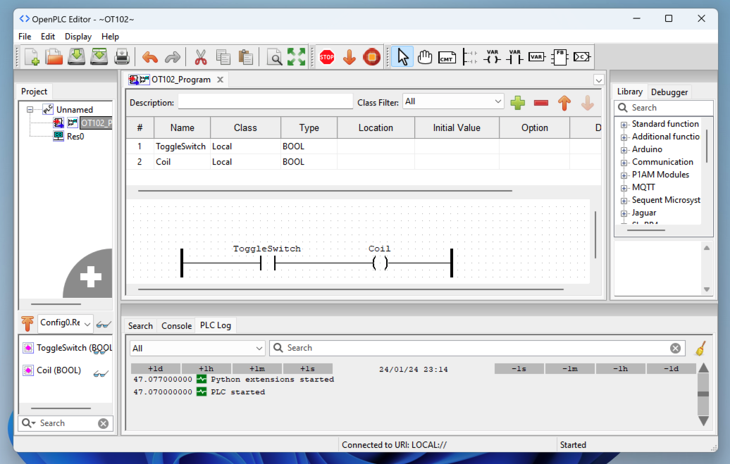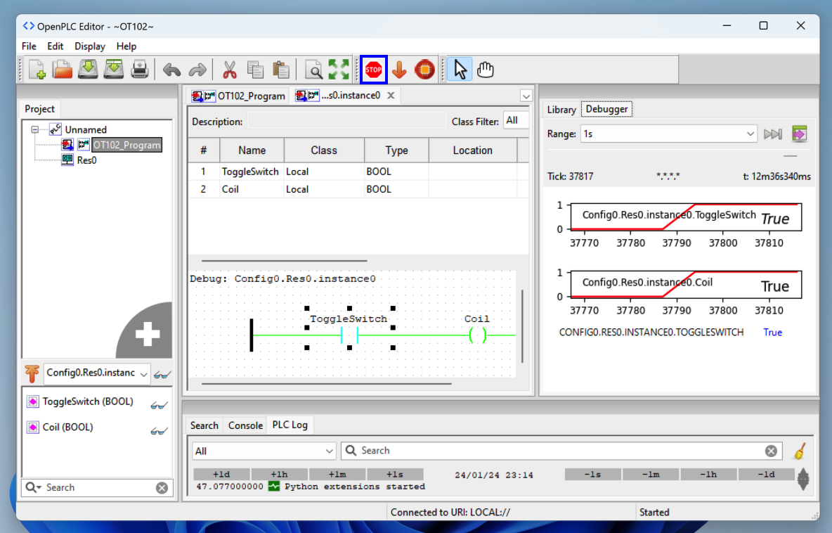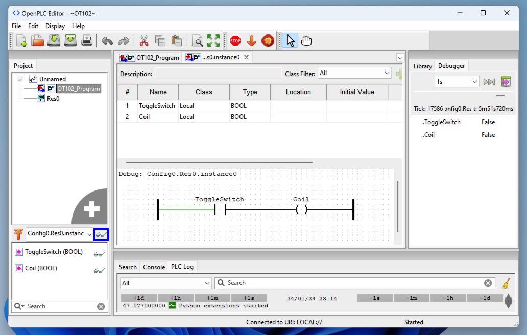 In OpenPLC Editor, at the top right, click the "Create a new contact" button, outlined in blue in the image below.