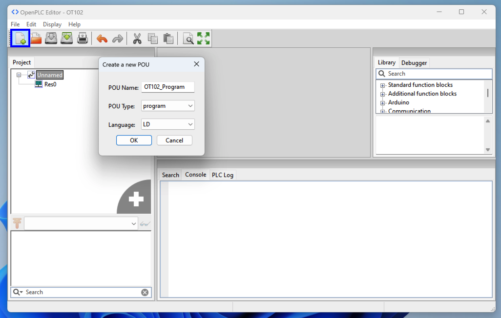 In OpenPLC Editor, at the top left, click the New icon, outlined in blue in the image below.