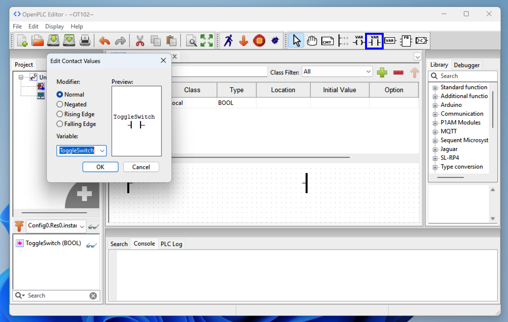 In the "Edit Contact Values" box, accept the default Modifier of Normal, select a Variable of ToggleSwitch, and click OK.