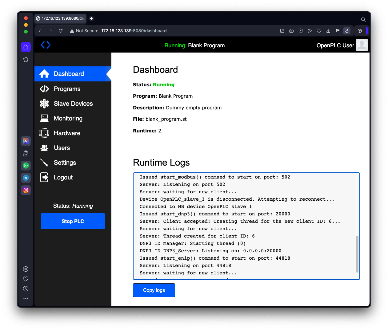 Log in with username openplc and password openplc