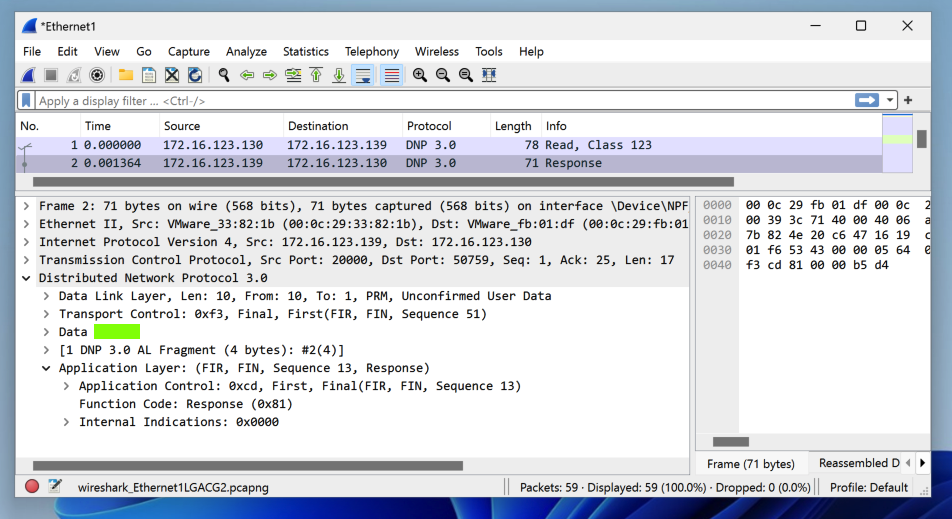 Wireshark shows DNP Read and Response packets, as shown below.In the top pane, click a Response packet.