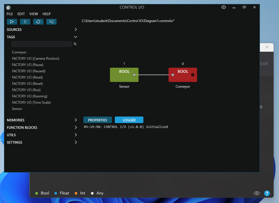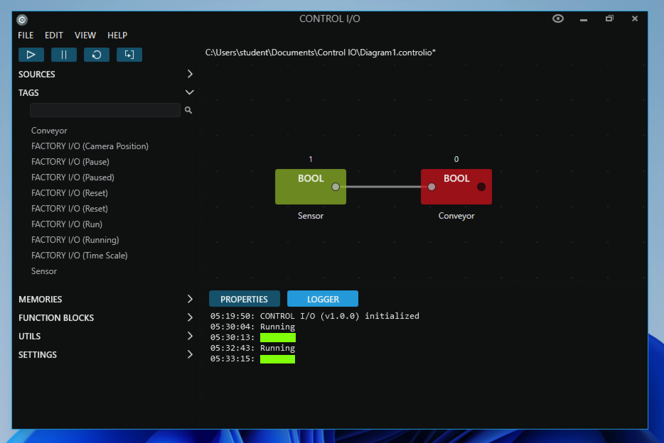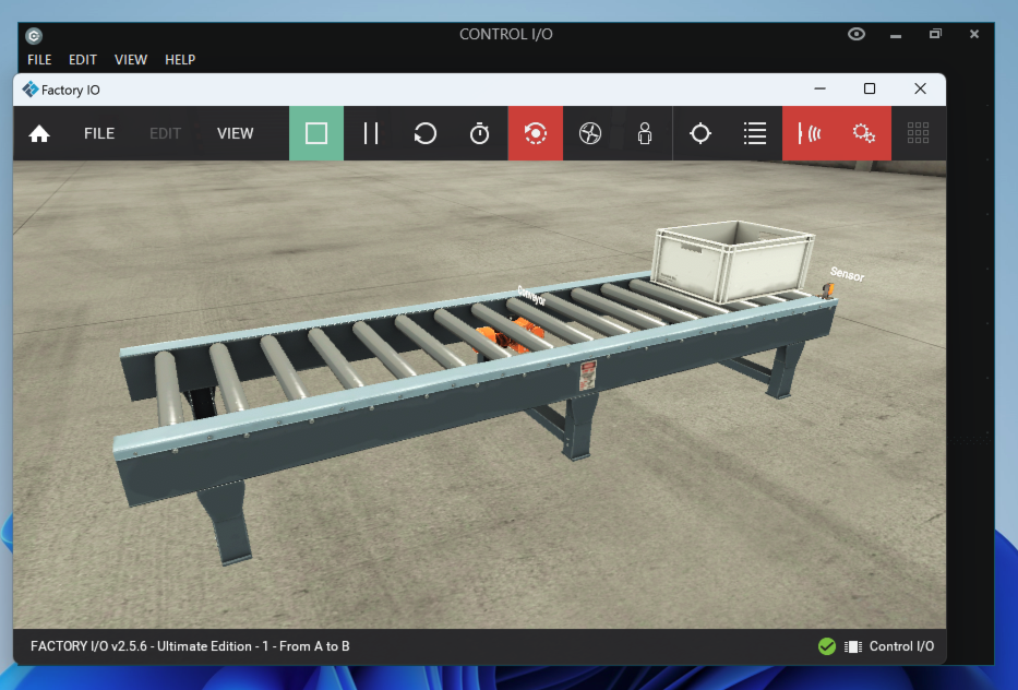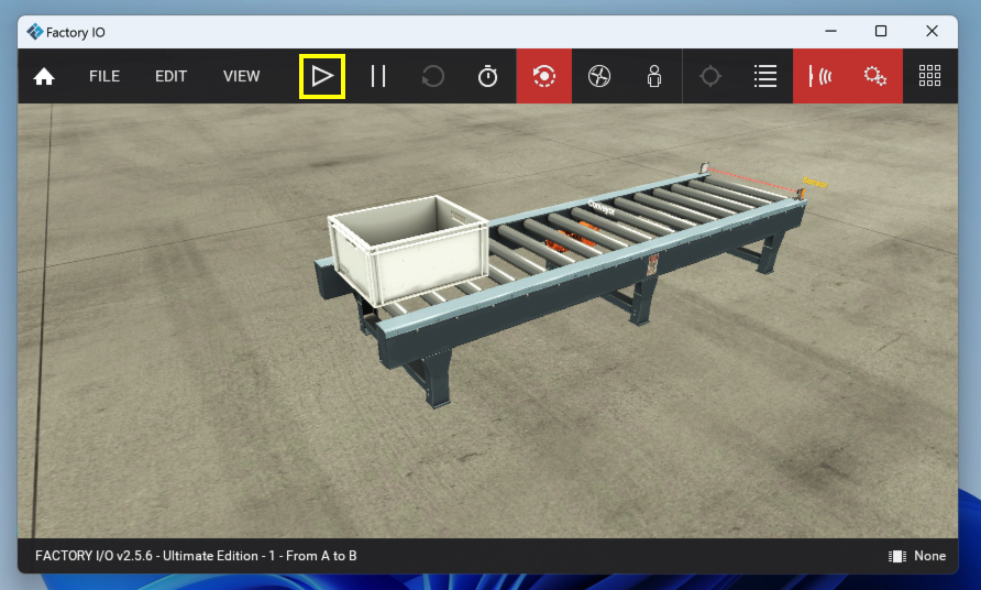 The goal of this scene is to run the Conveyor until the box reaches the Sensor, and then stop.
