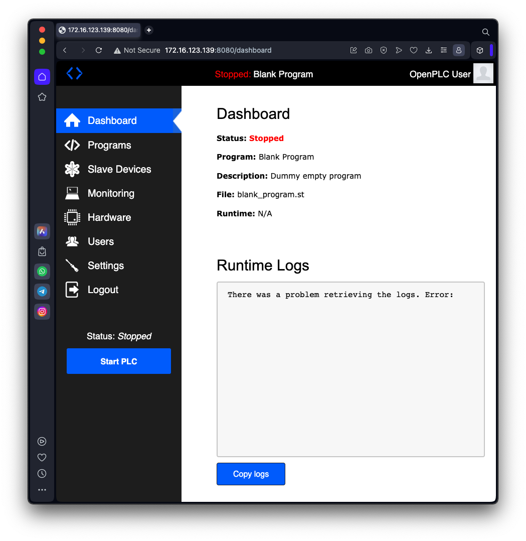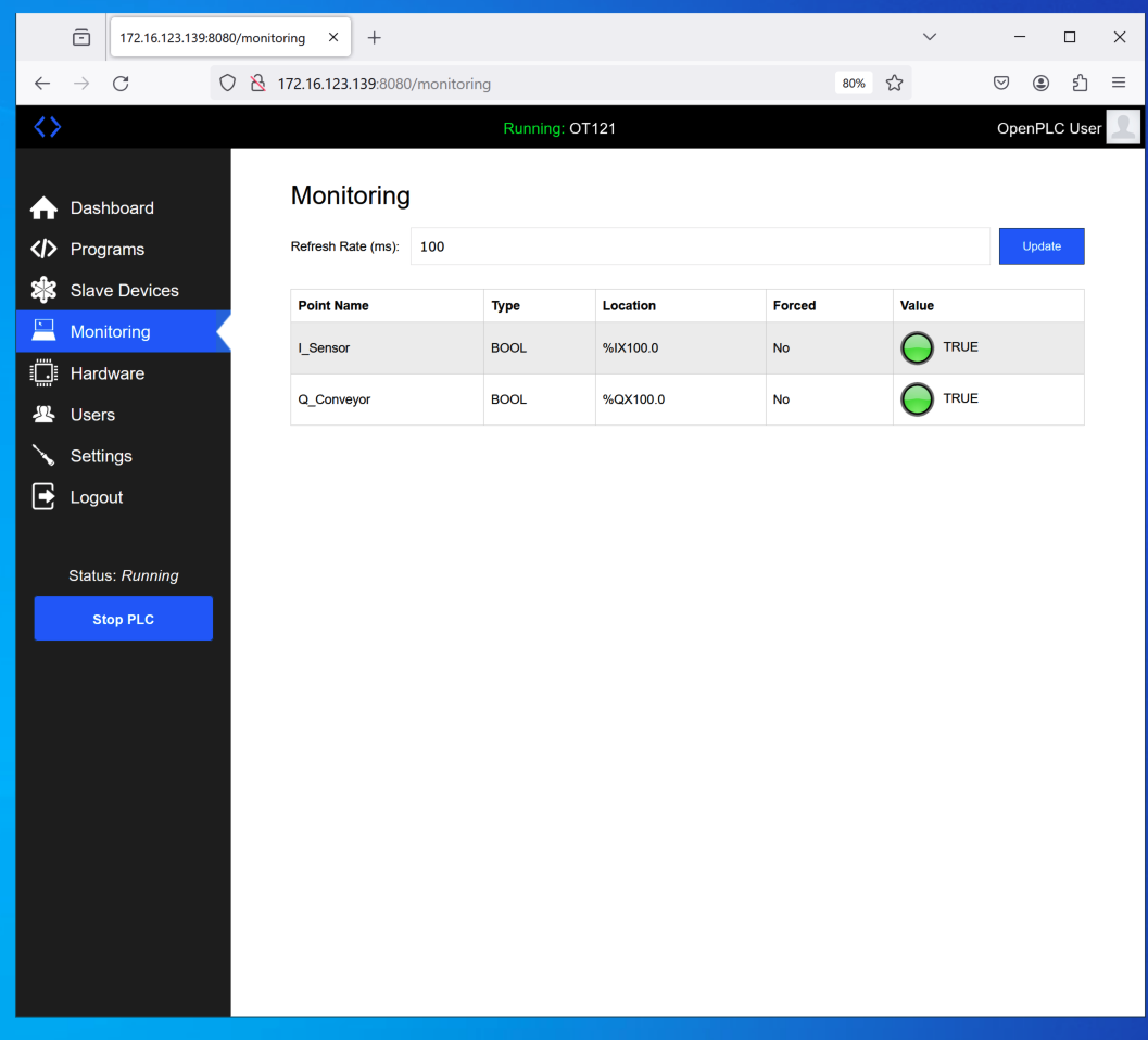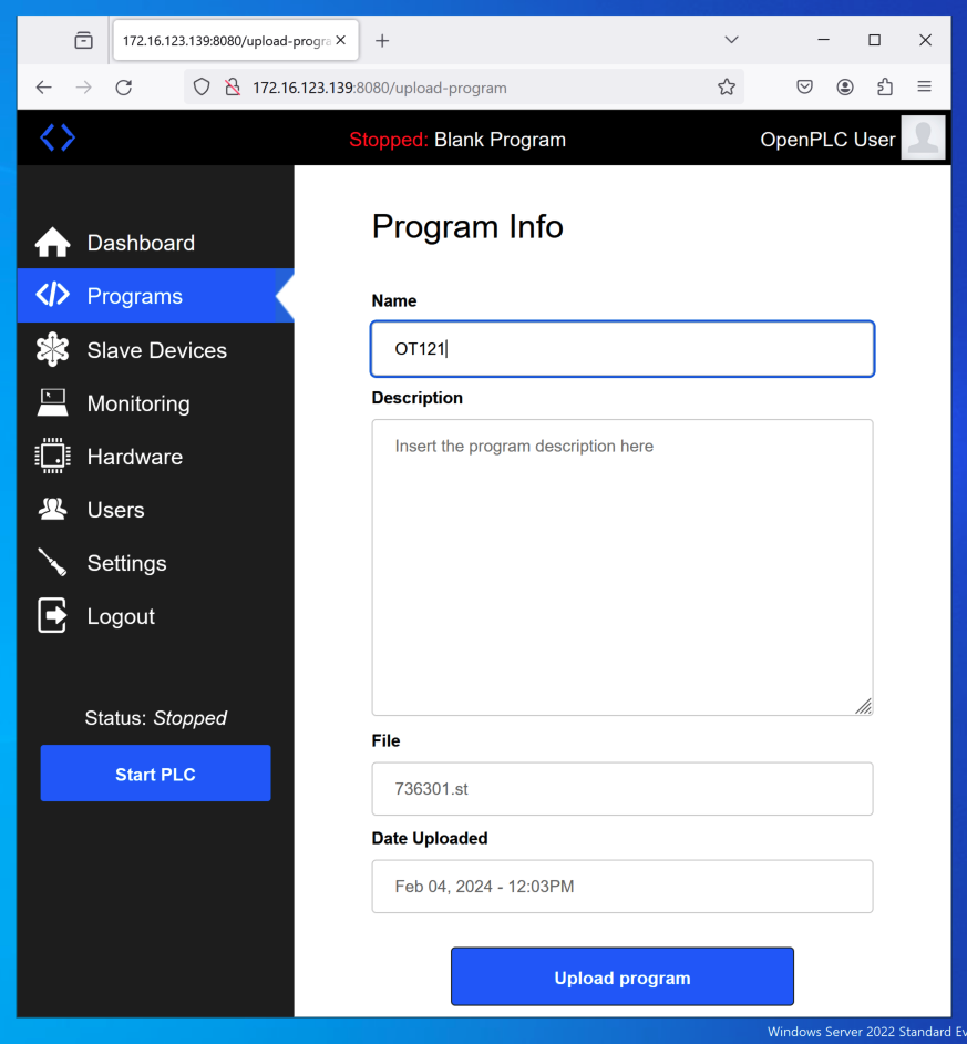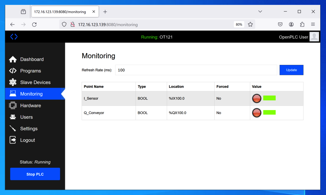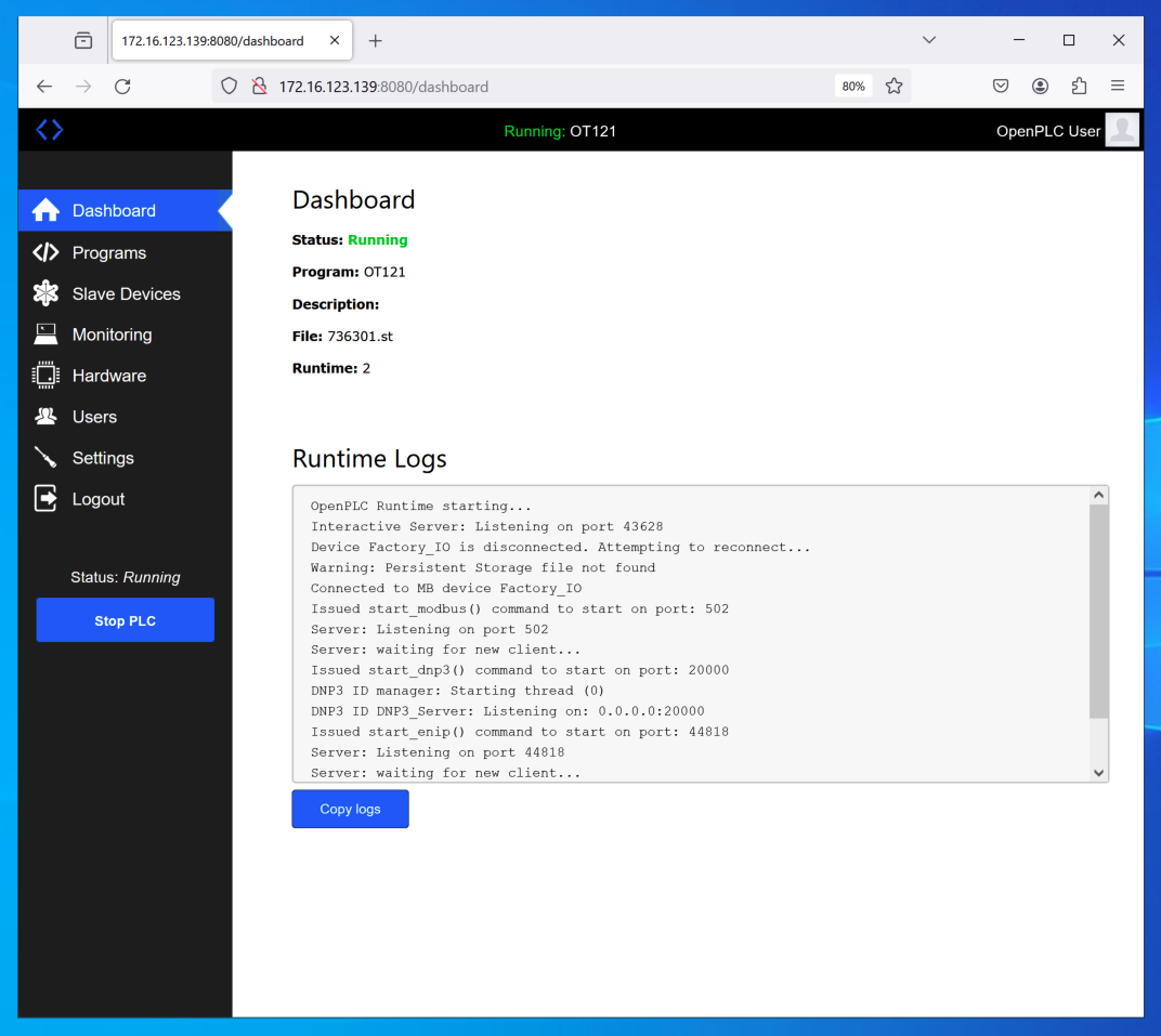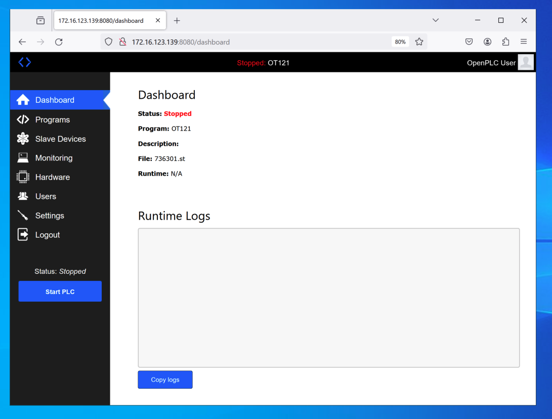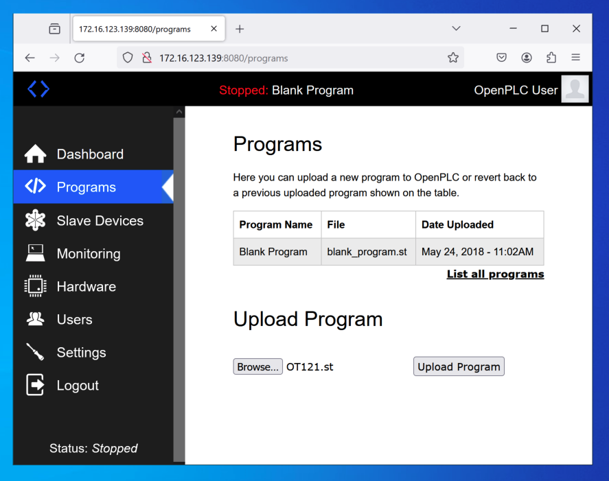 Suppose we, as an attacker, have a way to stop the PLC, with a DoS attack. To simulate that, in the OpenPLC Dashboard, click the "Stop PLC" button.