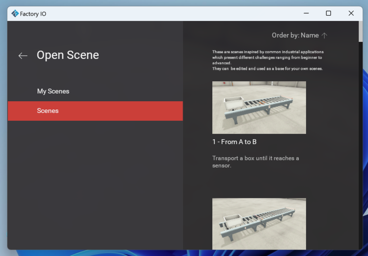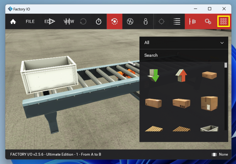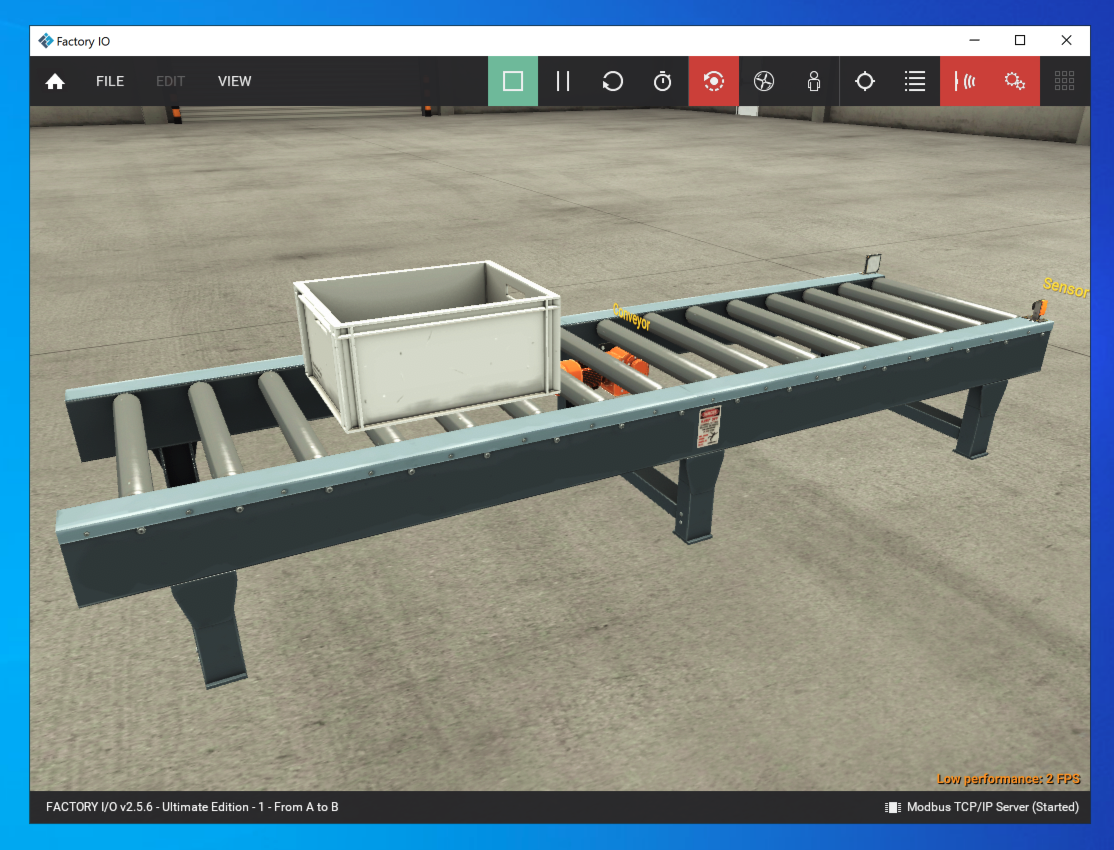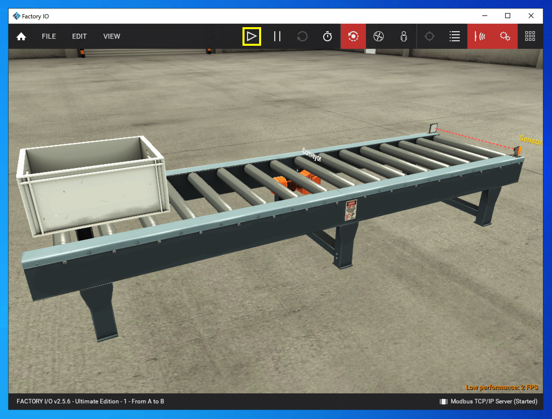 The Scene loads, showing a conveyor belts and a box, as shown below.