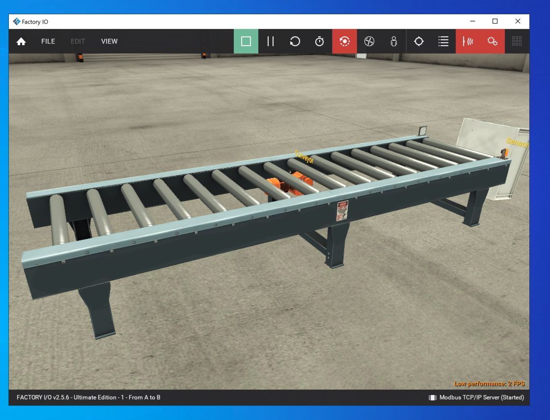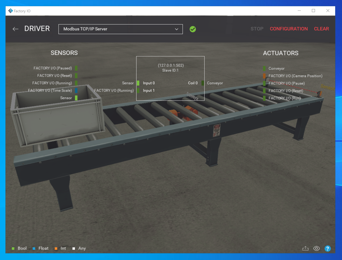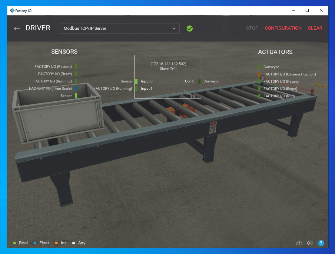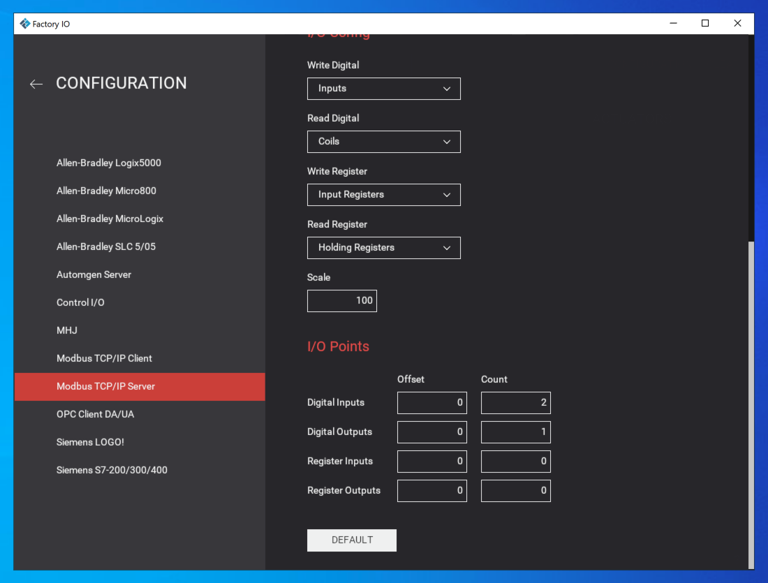 Device Name: Factory_IO Device Type: Generic Modbus TCP Device Slave ID: 1 IP Address: Your Factory IO IP Address IP Port: 502 Discrete Inputs: Start Address: 0   Size : 2 Coils: Start Address: 0   Size : 1 Input Registers: Start Address: 0   Size : 0 Holding Registers - Read: Start Address: 0   Size : 0 Holding Registers - Write: Start Address: 0   Size : 0