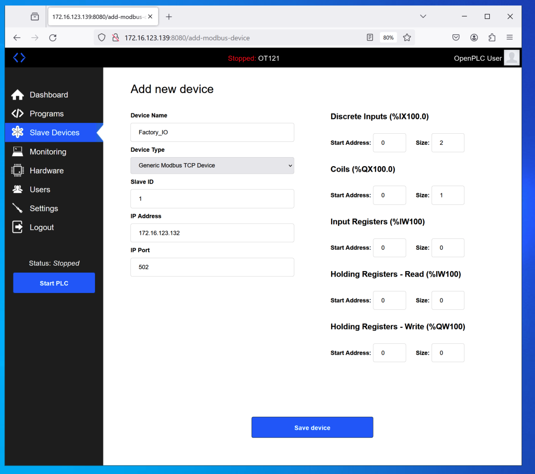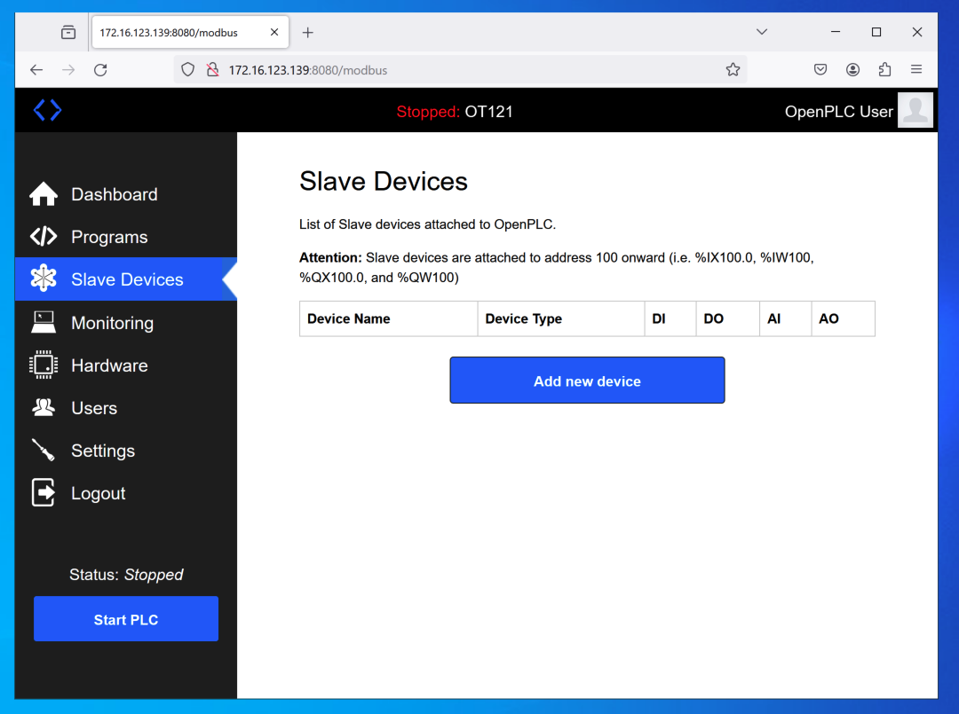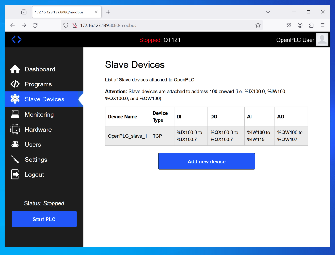 In the top center, notice that the correct IP address is now displayed, along with the Slave ID which is 1 by default.