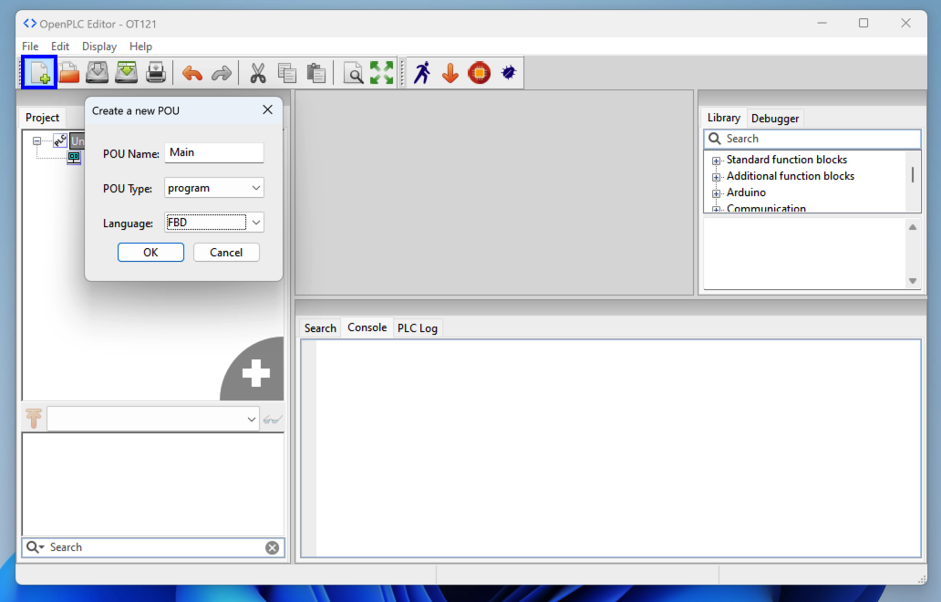In OpenPLC Editor, at the top left, click the New icon, outlined in blue in the image below.