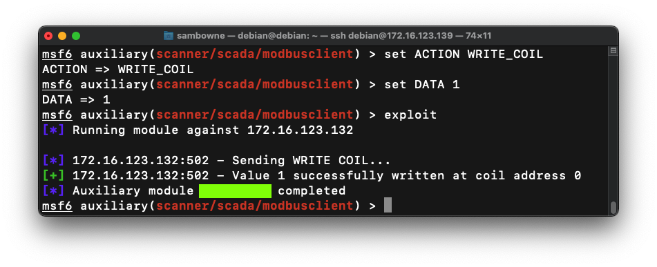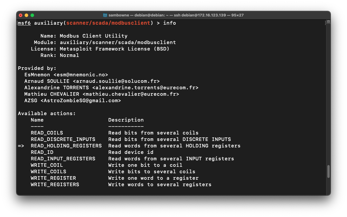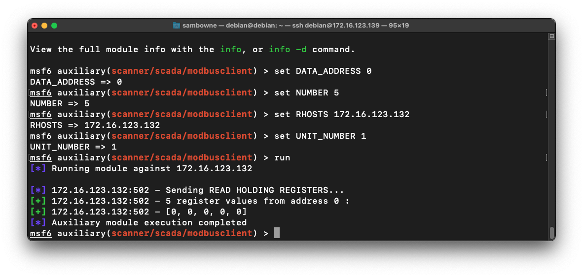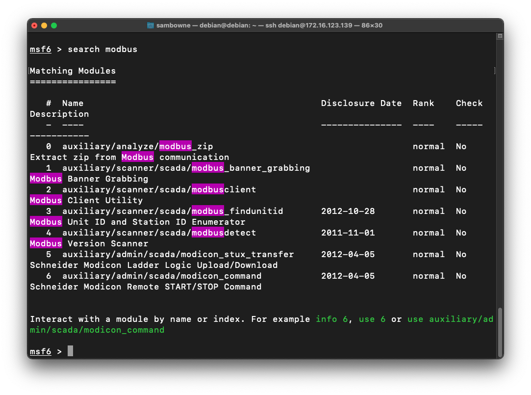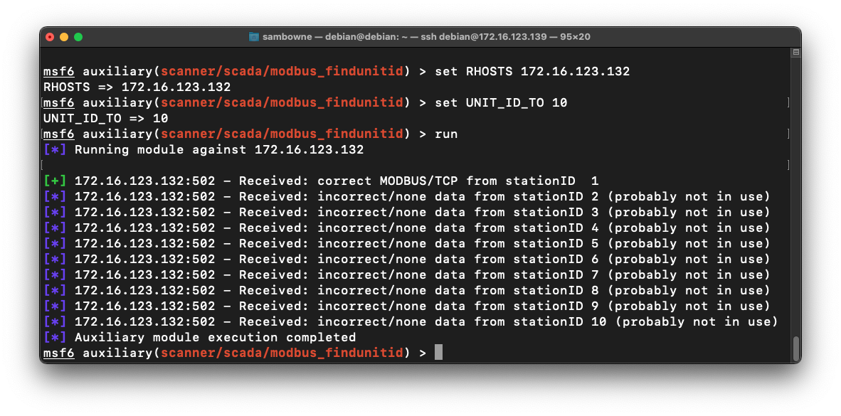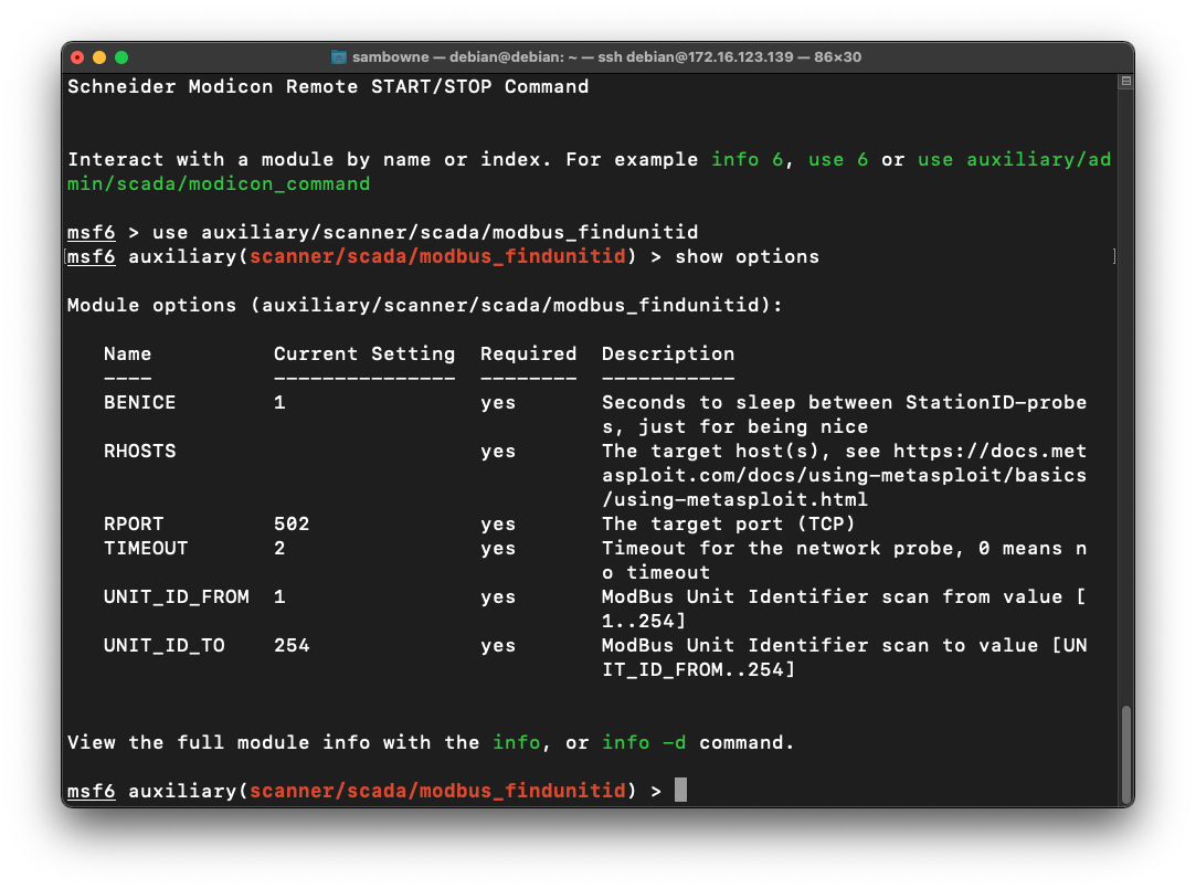 The only options we need to specify are RHOSTS (to tell it where the Modbus network is) and UNIT_ID_TO (to make the scan end more quickly).