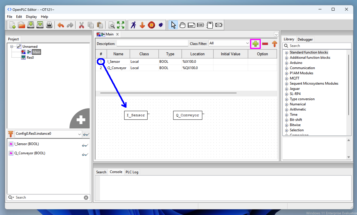 Drag the line from the I_Sensor box to the Q_Conveyor box, as shown below.