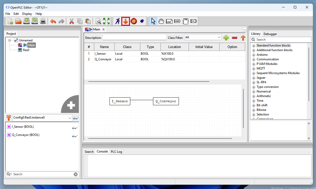 Click the yellow down-arrow icon, outlined in red in the image above, to generate a program for the OpenPLC runtime.