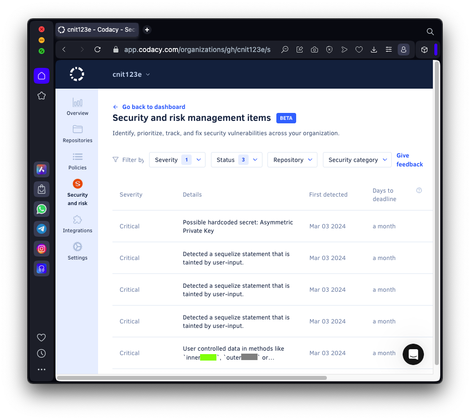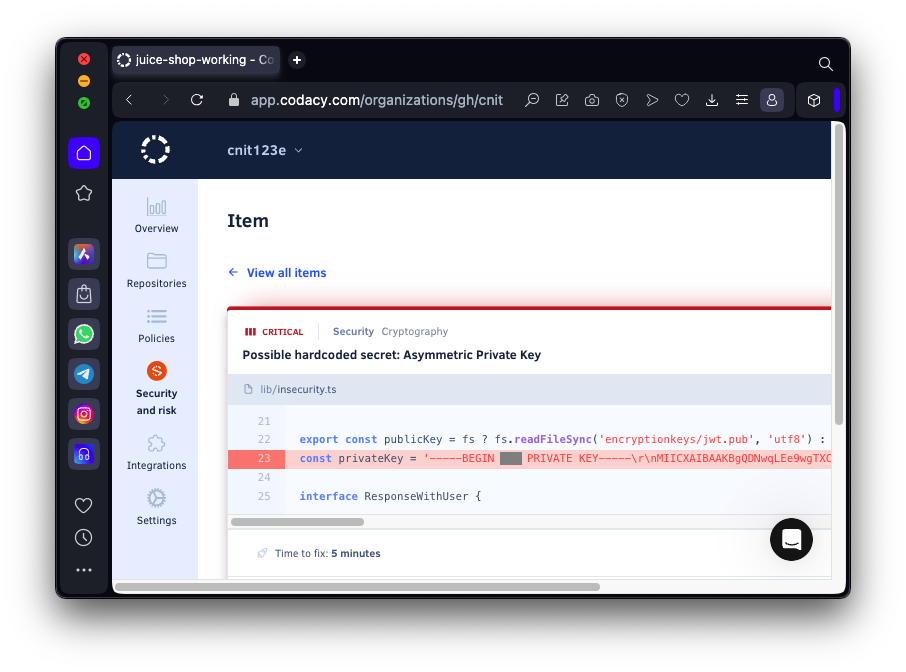 Notice that Codacy says you can fix this problem in five minutes.