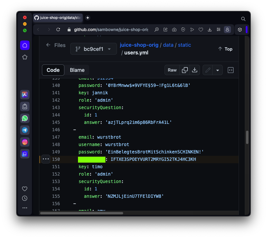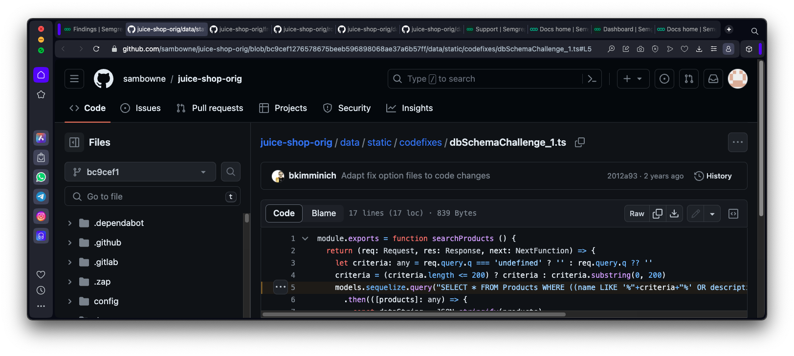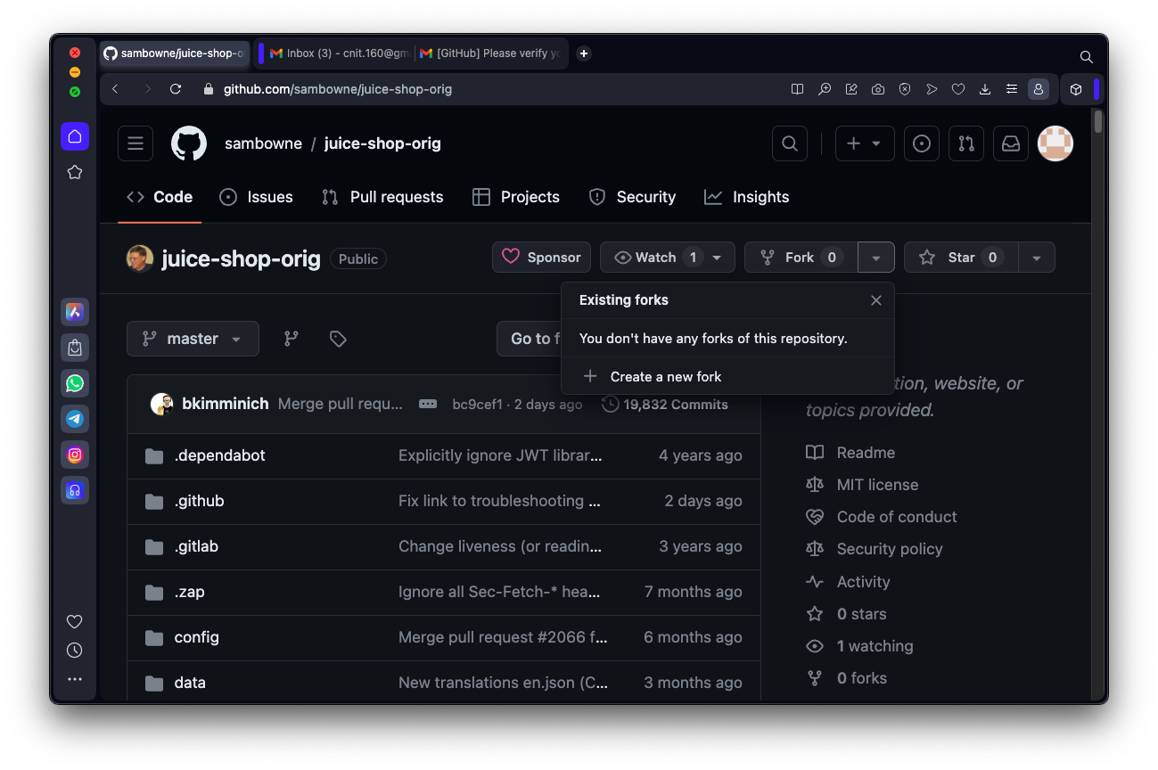 This is a deliberately vulnerable codebase from OWASP. Instead of forking the original code from OWASP, which may be changing, you'll copy my version, which is frozen in the state the code was on Mar 3, 2024.In a Web browser, go to https://github.com/sambowne/juice-shop-orig