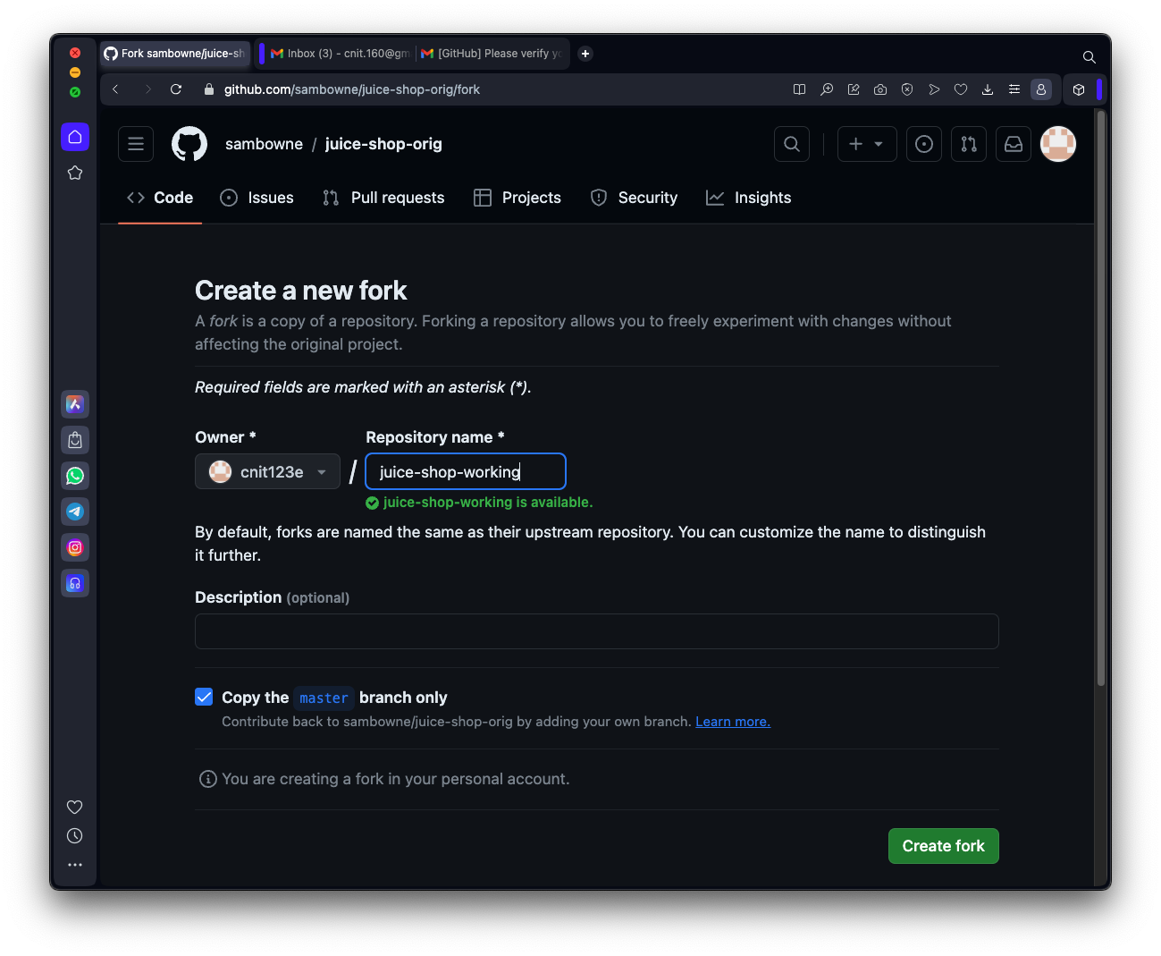 On the "Create a new fork" page, change the Repository name to juice-shop-working, and, at the bottom right, click the "Create fork" button, as shown below.