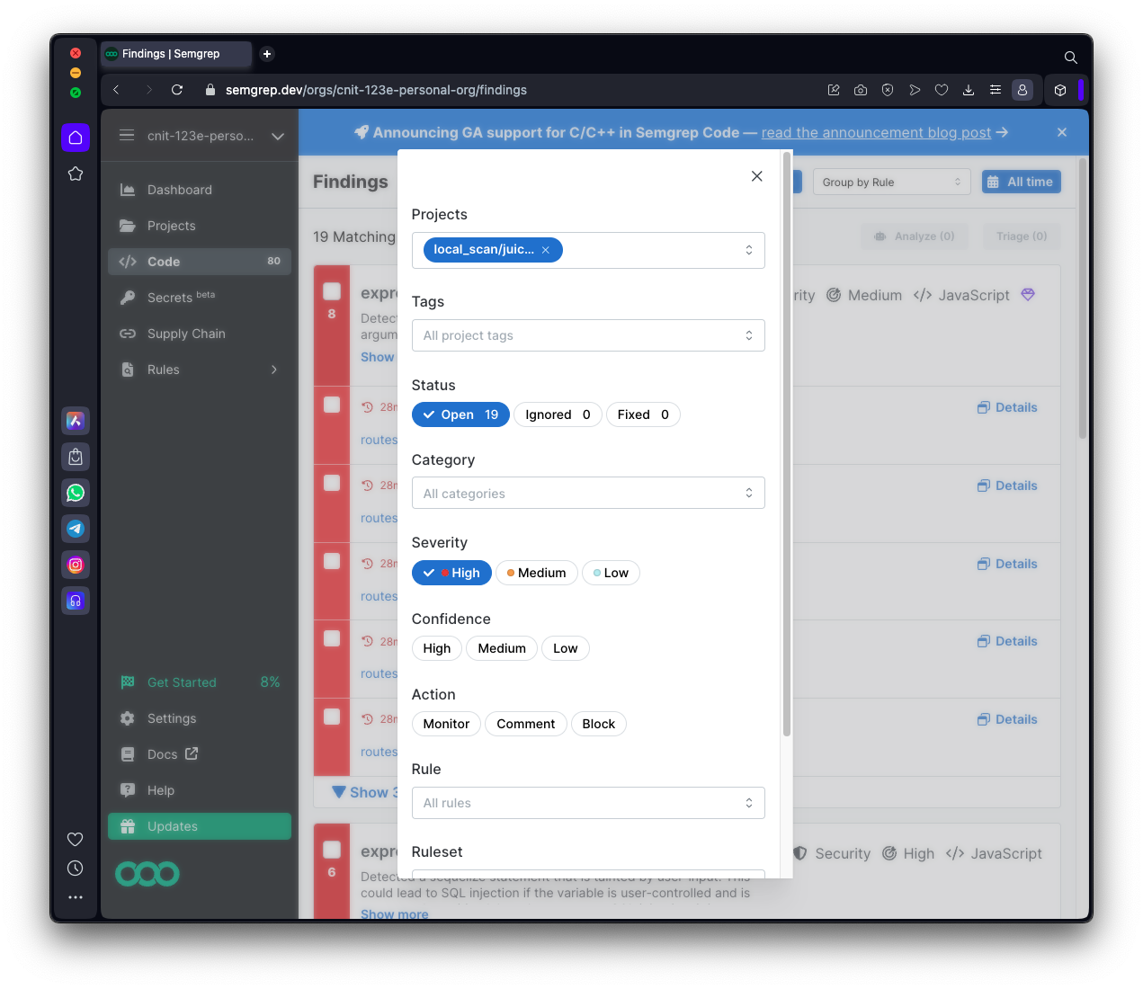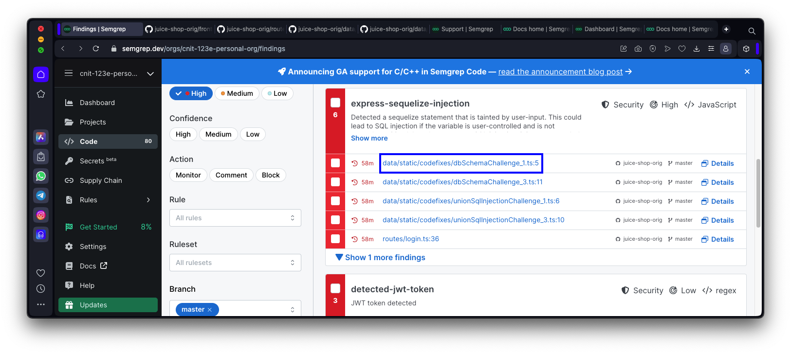 Semgrep finds a "Generic Secret". Examine that code.The flag is covered by a green rectangle in the image below.