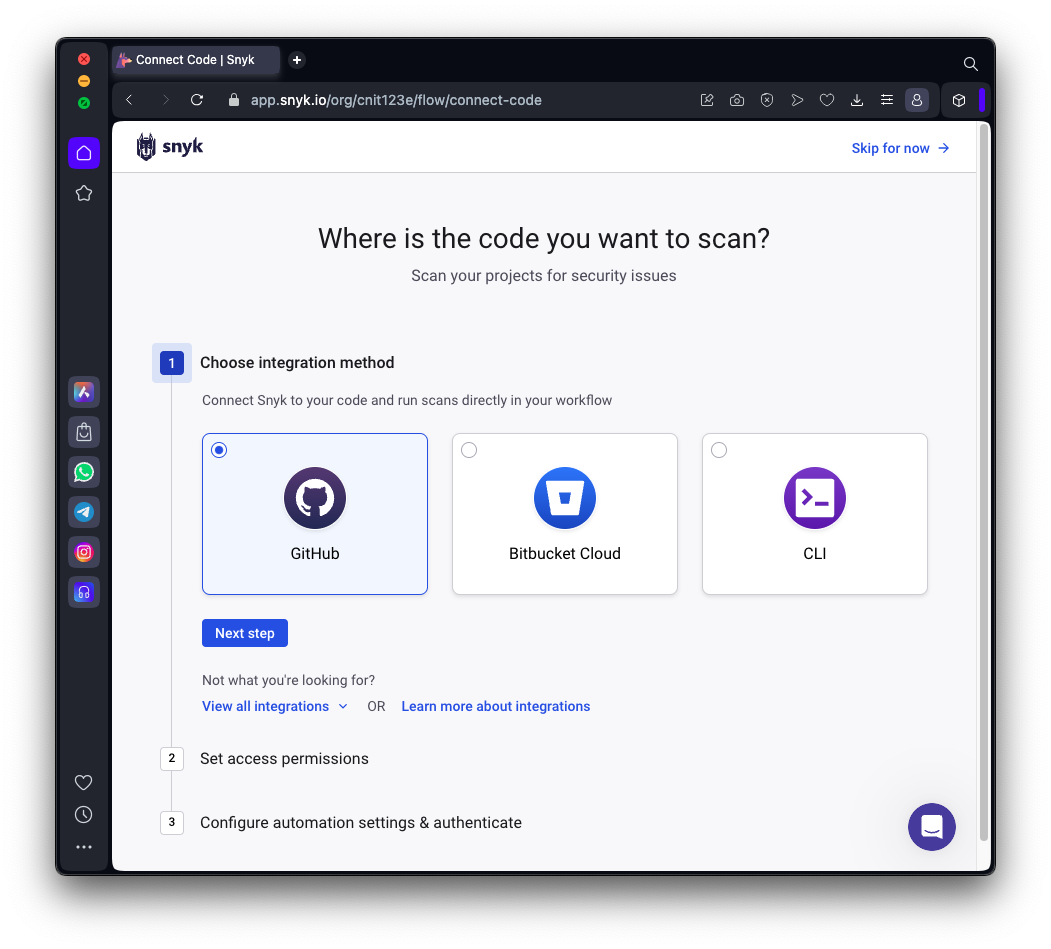 On the "Where is the code you want to scan" page, click Github, as shown below.