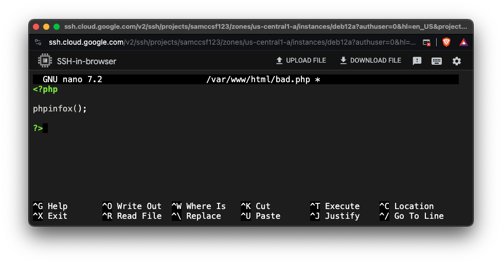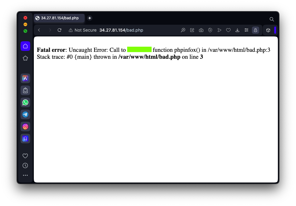 In a Web browser, open this URL, replacing the IP address with the external IP of your server:http://35.222.29.122/bad.phpThe flag is covered by a green rectangle in the image below.