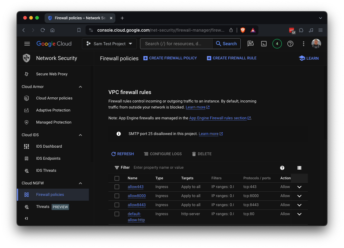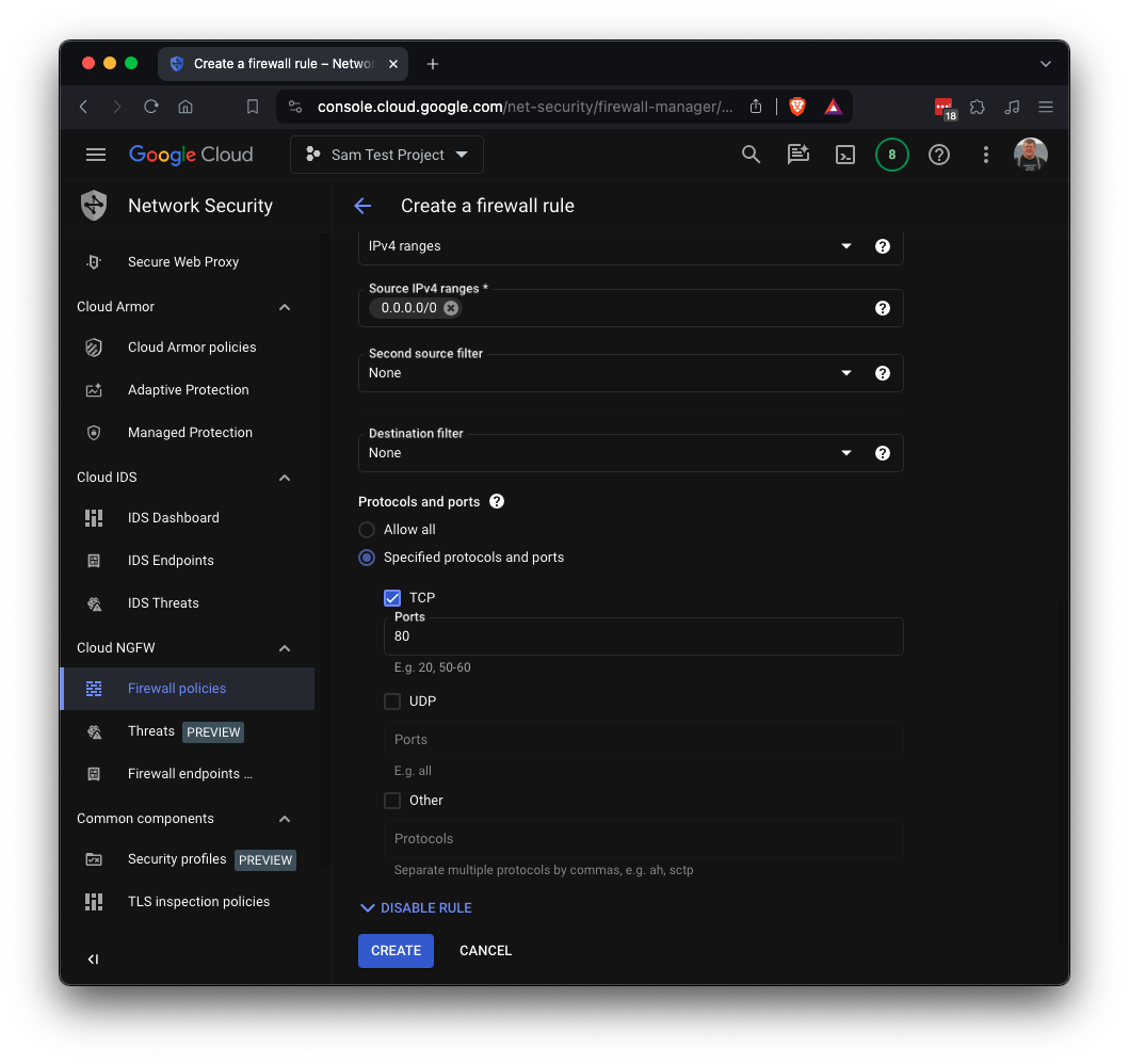 If not, at the top, click "CREATE FIREWALL RULE" and enter these values: