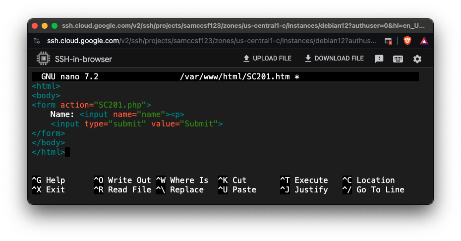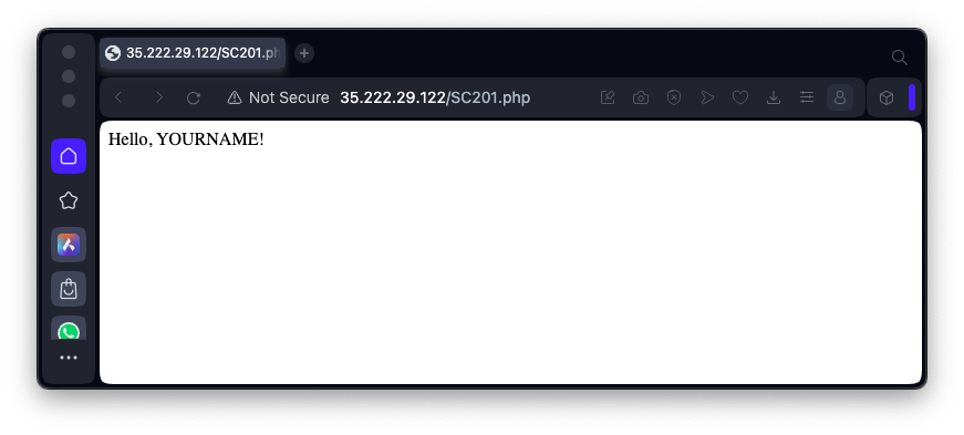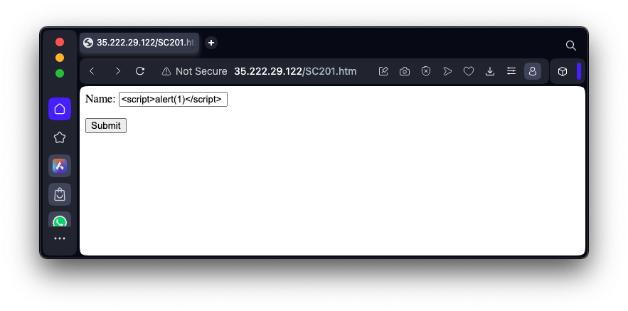 http://35.222.29.122/SC201.htmEnter your name into the form, as shown below, and click the Submit button.