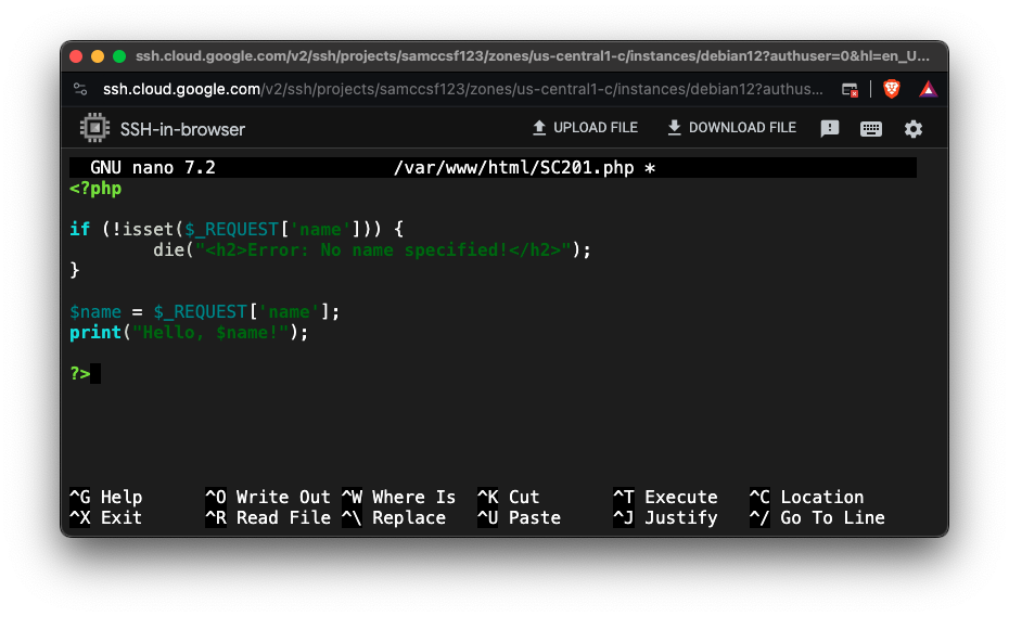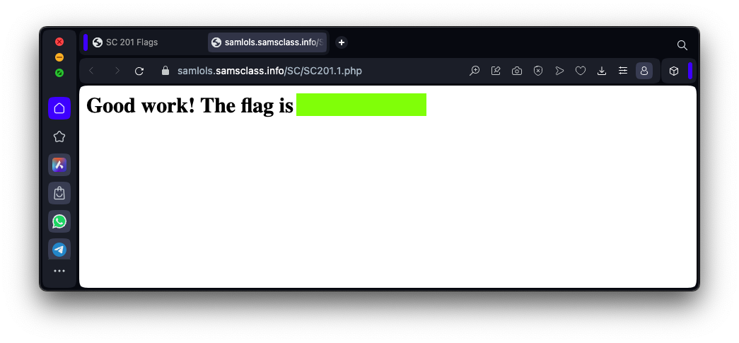 https://samlols.samsclass.info/SC/SC201.htmEnter the URL to your PHP page in the form for flag SC 201.2 and submit the form. If your code is correct, the flag will appear.