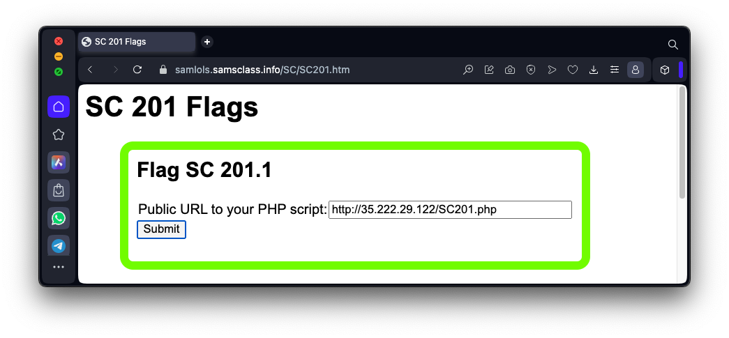 https://samlols.samsclass.info/SC/SC201.htmEnter the URL to your PHP page in the form for flag SC 201.1, as shown below, and click the Submit button.