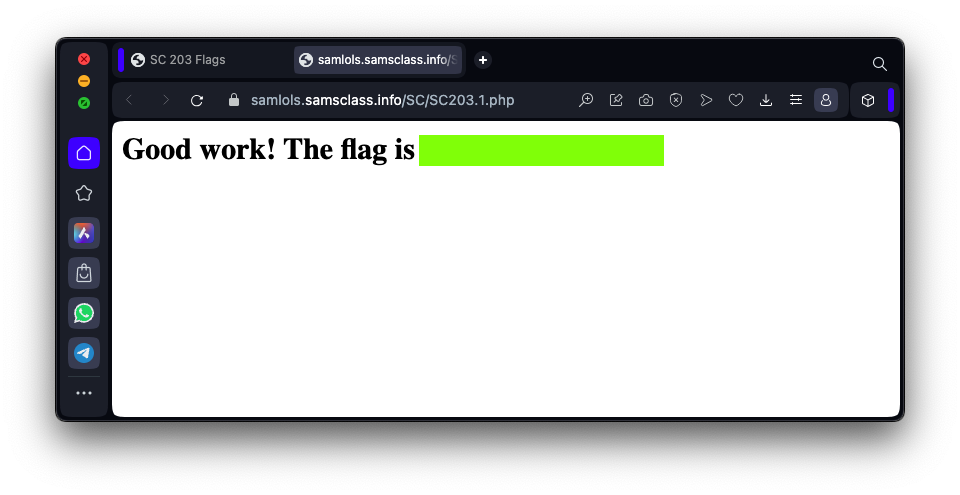 https://samlols.samsclass.info/SC/SC203.htmEnter the URL to your PHP page in the form for flag SC 203.2 and submit the form. If your code is correct, the flag will appear.