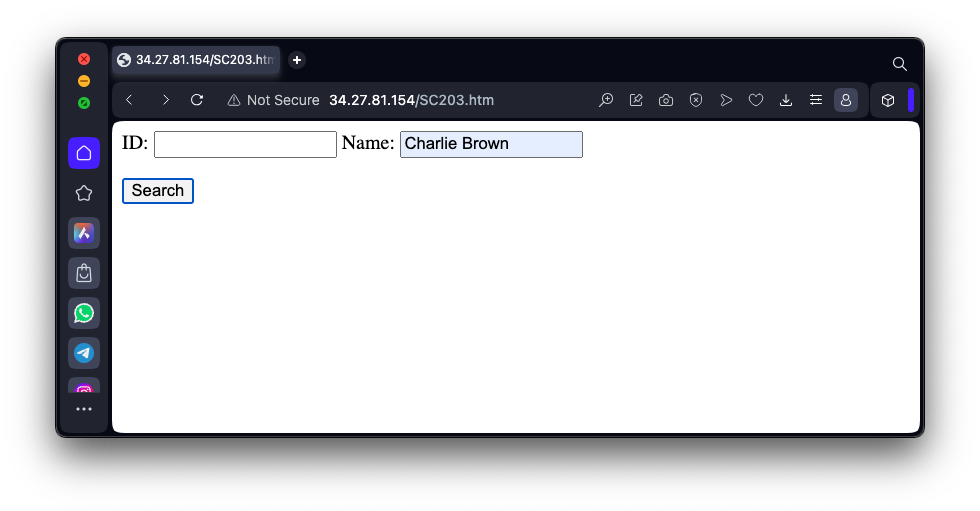 http://35.222.29.122/SC203.htmEnter a Name of Charlie Brown into the form, as shown below, and click the Search button.