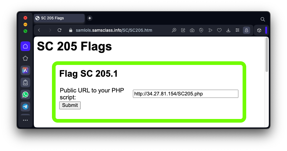 https://samlols.samsclass.info/SC/SC205.htmEnter the URL to your PHP page in the form for flag SC 205.1, as shown below, and click the Submit button.