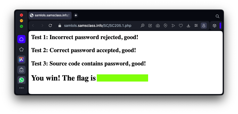 https://samlols.samsclass.info/SC/SC205.htmEnter the URL to your PHP page in the form for flag SC 205.2 and submit the form. If your code is correct, the flag will appear.