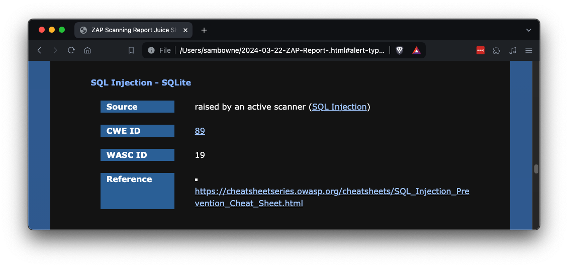 Click the Reference link to see an OWASP page about SQL Injections.