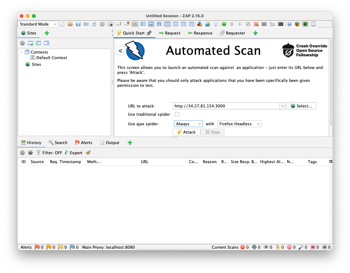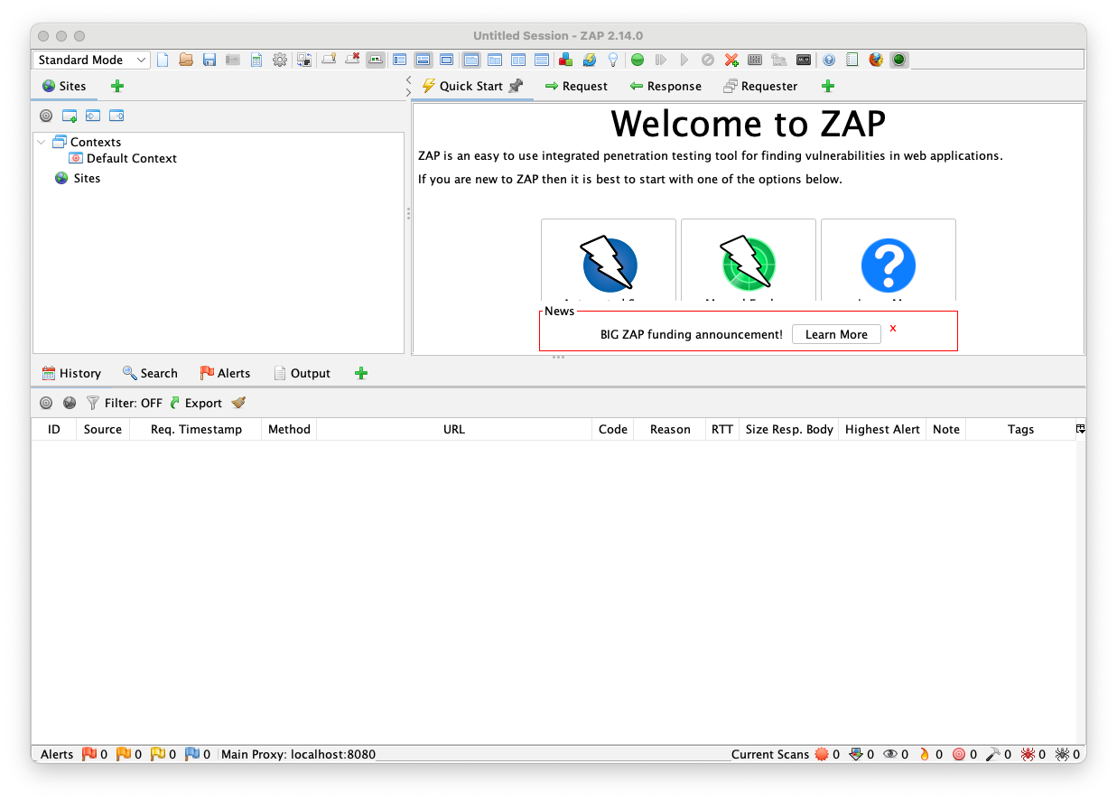 You see the main ZAP window, as shown below.
