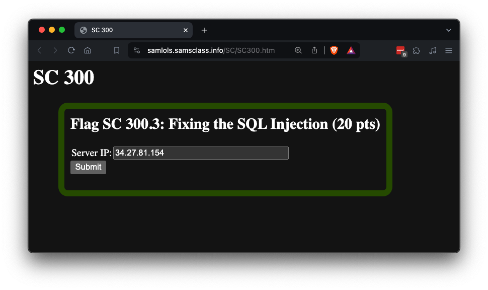 In a Web browser, open this page:https://samlols.samsclass.info/SC/SC300.htmEnter the IP address of your cloud Linux server in the form for flag SC 300.3, as shown below, and submit the form.If your code is correct, the flag will appear.