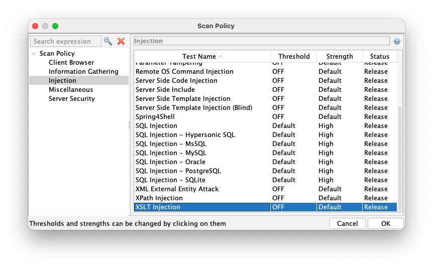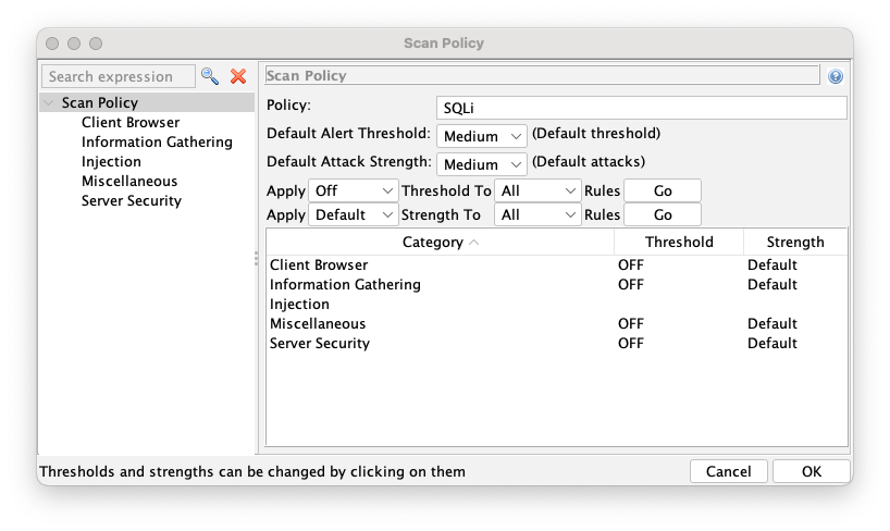 On the right side, scroll down to the "SQL Injection" tests. Change each of them to a Threshold of Default and a Strength of High, as shown below.