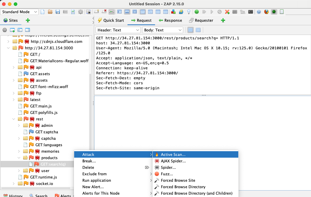 Right-click "GET:search(q)" and click Attack, "Active Scan...", as shown below.