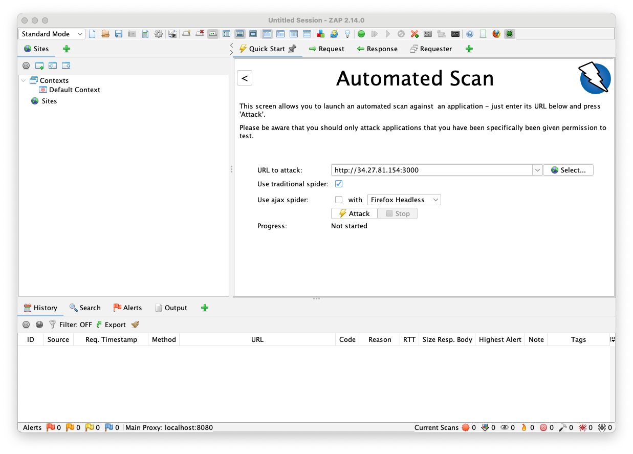 In the "URL to attack" field, enter the URL of your cloud OWASP Juice Shop page, as shown below.