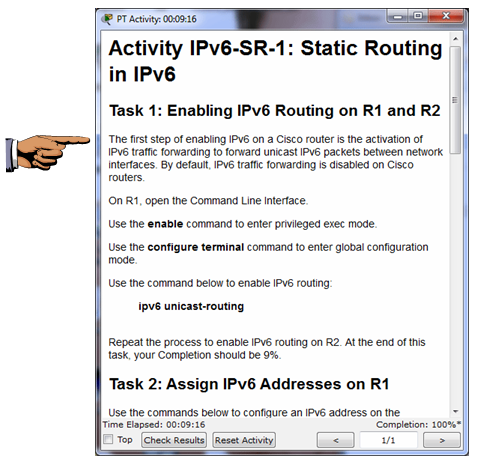 Double-click the pka file to open it in Packet Tracer. A little network appears, with a box that explains how to do the activity. When you complete the activity, the score will show 100% in the lower right of the box. Scroll back to the top so the project number is visible, and capture a screen image as shown below: