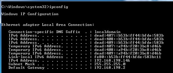 netsh int ipv6 set addr "Local Area Connection" dead:1::1/64