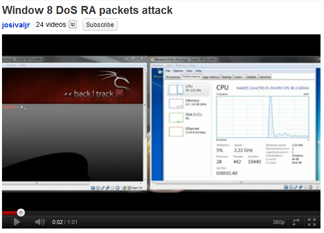 Win 7 DoS by RA Packets -- a slower, controllable version of the attack allows you to see just how many packets are required to stop a Windows machine.