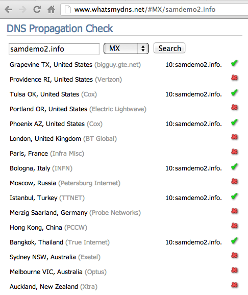 You should see the correct MX record for your domain on at least some of the domain servers, as shown below.