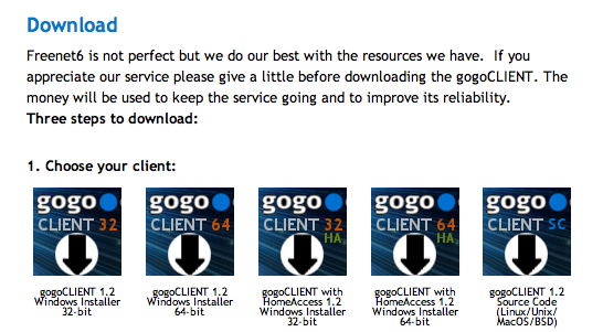 On the http://gogo6.com/ page, at the upper center of the page, click Services, "Download Freenet6 Client".