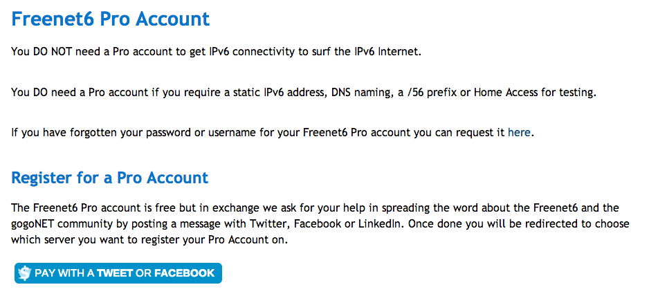 On the "Freenet6 Pro Account" page, click the "PAY WITH A TWEET OR FACEBOOK" button.