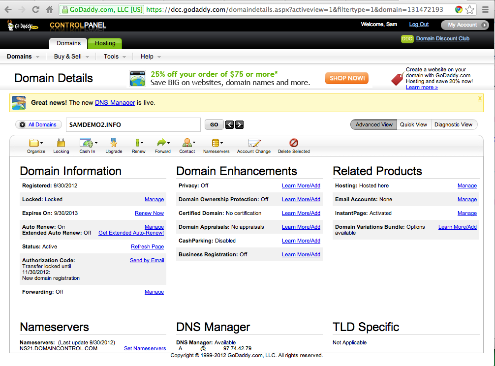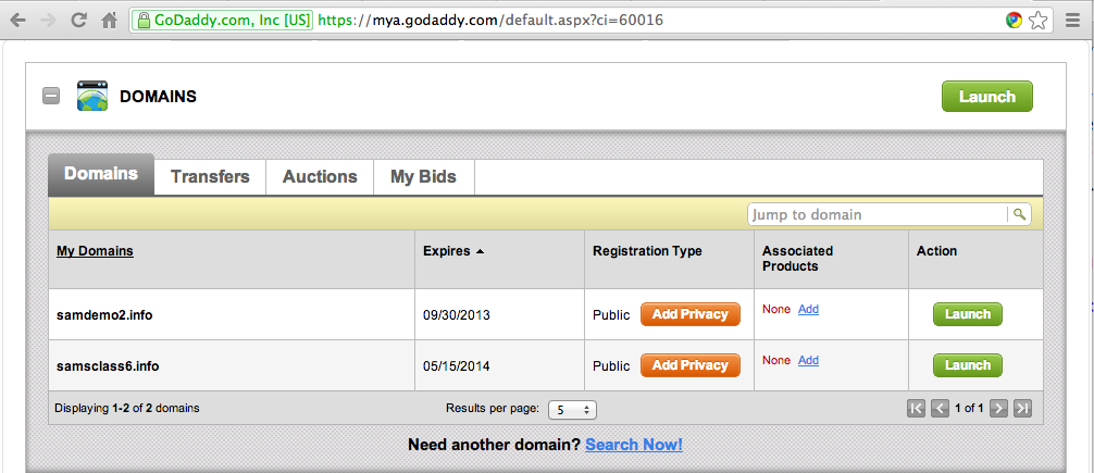Go to godaddy.com. In the middle of the page, type your desired domain, and choose a top-level domain. I recommend using .info because I know there are top-level glue records for it. But as time passes, more and more top-level domains will have full IPv6 compatibility, so other choices will become OK. Click Go.
