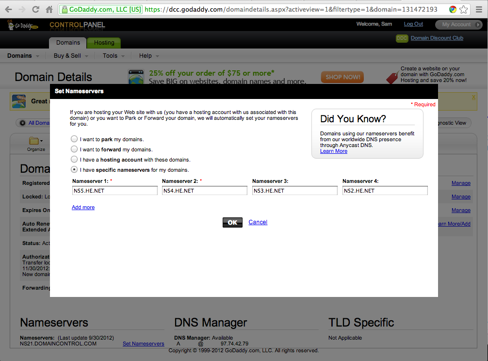 The "domaincontrol.com" servers are at GoDaddy. When DNS updates, you will see "he.net" servers instead.