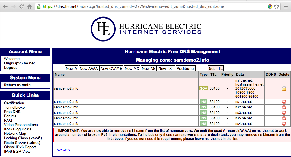 NOTE: You may see no SOA records at all at this point. I think that means GoDaddy has updated your nameservers to forward to HE.NET, and there are no HE.NET DNS records yet. In that case, just proceed to the following steps, and when you configure your HE.NET records the SOA should become visible.